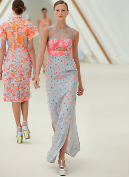 2013 İlkbahar Yaz koleksiyonunda dantel, organze ve şifon üzerinde renkli işlemelerle ışıltı katmış ve yine Erdem kalitesini ortaya koymuş.